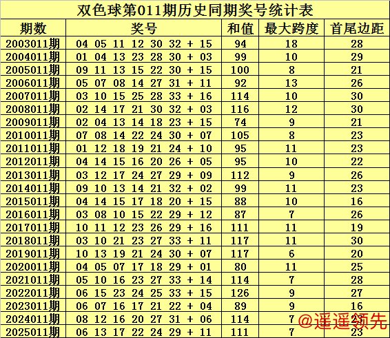 和值推荐:在双色球第011期历史同期开奖中,红球和值全部分布在74-126区段,今年同期看好小 号区段和值开出,参考70-80之间的和值。